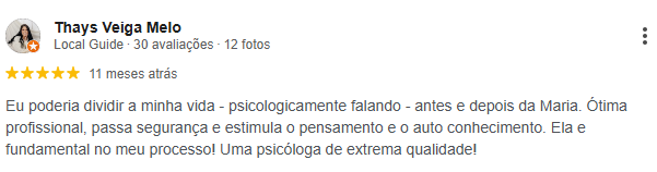 Publicado em Lili 320/01/2025Trustindex verifica se a fonte original da avaliação é Google. Tenho sido acompanhada pela a Psicóloga Maria há anos, e sua abordagem profissional tem sido fundamental na minha jornada. Conheci seu trabalho através de amigas que moram nos EUA, que já a recomendavam com grande entusiasmo. Mesmo morando em Portugal, o ajuste de horários sempre foi possível e agradável, sem grandes dificuldades. Seus atendimentos online são de extrema excelência, com muito foco e dedicação. A sua escuta atenta e abordagem sensível ajudaram-me em várias fases da minha vida, incluindo desafios da imigração, adaptações a novas etapas e até momentos de depressão profunda em que não via nada além da escuridão. Com seu apoio, consegui encontrar novas perspectivas e fortalecer meu equilíbrio emocional. Se busca uma profissional empática, ética e verdadeiramente comprometida com o bem-estar dos seus pacientes, recomendo Maria sem hesitação! Seria nota 10 se tiver se essa possibilidade aqui.Publicado em Lucy Gleide Silva02/12/2024Trustindex verifica se a fonte original da avaliação é Google. Uma experiência enriquecedora, fui muito bem acolhida e bem direcionada. Maria é uma excelente profissional, conduz muito bem o paciente, trazendo sempre uma abordagem de fácil compreensão. Só tem que agradecer pela a minha evolução!!!Publicado em Angelita Lima26/11/2024Trustindex verifica se a fonte original da avaliação é Google. Maria já me salvou inúmeras vezes! Na minha trajetória passei por outros profissionais no início e de longe Maria foi a que de fato me ajudou. Ela me conhece, me ajuda a viver e é fundamental no meu tratamento. Sem ela, eu teria penado mais com as coisas da vida e do meu passado. Que bom que posso contar com seu trabalho tão forte, dedicado e sensacional!Publicado em Laise Azevedo09/11/2024Trustindex verifica se a fonte original da avaliação é Google. Iniciei meu acompanhamento com a Maria em fevereiro de 2022, e, desde então, cada sessão tem sido fundamental para o meu desenvolvimento pessoal. A Maria é uma profissional incrível e extremamente acolhedora, que cria um ambiente seguro e confortável, onde me sinto completamente à vontade para desabafar sobre qualquer tema, sem qualquer julgamento. Ela sempre reforça que aquele é o meu momento, e essa postura faz toda a diferença. Mesmo sendo paciente online desde o começo, nunca senti que a distância fosse um obstáculo; a Maria conduz nossas sessões de forma tão dedicada e cuidadosa que até a barreira geográfica deixa de existir. É evidente que, para ela, oferecer um atendimento de excelência vai além de uma mera chamada de vídeo. Recomendo a Maria de coração, pois seu trabalho e sua sensibilidade transformam vidas!Publicado em Karen Eliziario09/11/2024Trustindex verifica se a fonte original da avaliação é Google. Sou muito grata pelo trabalho de Maria. Ela é respeitosa e humana em todas as nossas sessões.Ela tem empatia,e proporciona um ambiente seguro e agradável. Recomendo seus serviços a qualquer pessoa que esteja buscando um bom profissional.Publicado em Gabi Brandão30/10/2024Trustindex verifica se a fonte original da avaliação é Google. Eu não consigo expressar o quanto a Maria tem sido importante na minha vida. Mesmo morando fora do Brasil, nos Estados Unidos, ela conseguiu me ajudar a superar traumas e me proporcionar ferramentas valiosas para lidar com os desafios do dia a dia. Sua empatia e compreensão foram fundamentais para que eu pudesse me redescobrir e viver a minha melhor vida. Sou eternamente grata pelo apoio e dedicação dela. Recomendo a todos que buscam crescimento pessoal e transformação!Publicado em Ana Beatriz Freitas30/10/2024Trustindex verifica se a fonte original da avaliação é Google. O que falar da Dra Maria a não ser dizer que ela mudou a minha vida? Tentei inúmeras psicólogas antes de encontrá-la e nunca vi tanto a psicologia fazer sentido como vejo nas minhas sessões com Maria.Publicado em Patrícia Lucena28/10/2024Trustindex verifica se a fonte original da avaliação é Google. Fazer terapia com Maria Cezar foi transformador. Estamos juntos há 8 anos, e, ao longo desse tempo, ela tem me ajudado a tomar as melhores decisões da minha vida e a me reencontrar. Com a ajuda dela, consegui vencer uma fase difícil e sair da beira da depressão sem precisar de medicamentos. Hoje me sinto feliz e em paz comigo mesmo, e parte disso devo a ela. Além de tudo, o consultório é muito aconchegante, o que torna cada sessão ainda mais acolhedora. Maria é uma profissional extremamente qualificada, dedicada e atenciosa, sempre em busca do melhor para seus pacientes. Recomendo de coração!Publicado em Vivian Teodoro28/10/2024Trustindex verifica se a fonte original da avaliação é Google. Eu a Psi Maria temos uma longa história, conheci na infância e a nossa conexão foi tão espontânea e especial que nunca a esqueci. Depois de anos (coloca anos nisso) finalmente nós encontramos e voltei a fazer terapia com ela, que era uma vontade. Eu sou grata pela minha Psi, amo nossa conexão, e não me vejo mais sem ela. Apesar de ser online, me sinto muito a vontade. Eu realmente tenho uma Psi para chamar de minha❤️. Obrigada Maria por ser tão especial e fazer parte da minha vida.Publicado em André dos Santos Silva24/10/2024Trustindex verifica se a fonte original da avaliação é Google. Adoro o atendimento da Dra. Maria, sua escuta é atenta e pontual ao desvendar os detalhes da nosso tratamento. Certamente retornarei a ela caso necessite novamente.Certificado: TrustindexO selo verificado do Trustindex é o Símbolo Universal de Confiança. Apenas as melhores empresas podem obter o selo verificado que tem uma pontuação de avaliação acima de 4.5, com base nas avaliações dos clientes nos últimos 12 meses. Leia mais